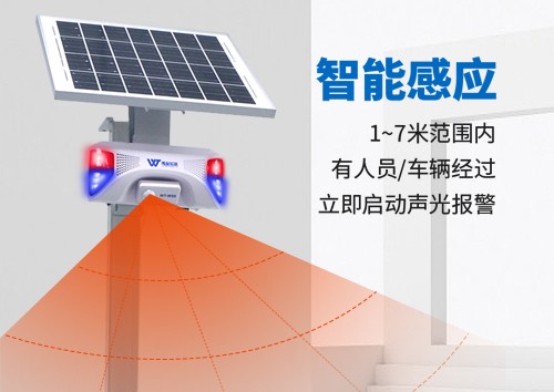概述:WT-WS6太阳能声光语音报警器是我司最新研发的一款产品,本产品采用红外热释电人体感应技术,当人经过感应区域时,会立即触发播报语音。产品拥有红外遥控和微信小程序功能,可进行声音调节、选曲,定时等功能。产品外观简洁、安装便捷、操作简单、低功耗设计,具备户外防水能力,采用专用抗老化材料,使用寿命长,广泛应用于各大景点,水库、施工现场、厂区车间、交通路口、车站,码头,地铁,机场等公共场所。为了解本产品功能及使用,请先预览说明书。 产品特点:1、匹配AC110-220V转DC12V2A电源适配器或15V1A太阳能光伏板(可选配)。2、内置锂电池、带充电管理(可选配)。3、红外热释电人体感应,感应灵敏范围宽。4、10W喇叭,声音洪亮。5、支持U盘更换语音。6、红外遥控支持音量调节、曲目选择、警示灯白天开启/关闭。7、微信小程序设置单曲、全部播放、定时设定等功能(可选配)。参数配置:产品名称:太阳能语音提示器型 号:WT-WS6报警响度:≥100dB(平行间隔一米)感应距离:0-7米(正面感应距离)供电方式:DC12V/2A语音更换:通过USB数据线连接电脑更换/手机小程序更换语音工作温度:-20~40℃防水等级:IPX5产品展示: